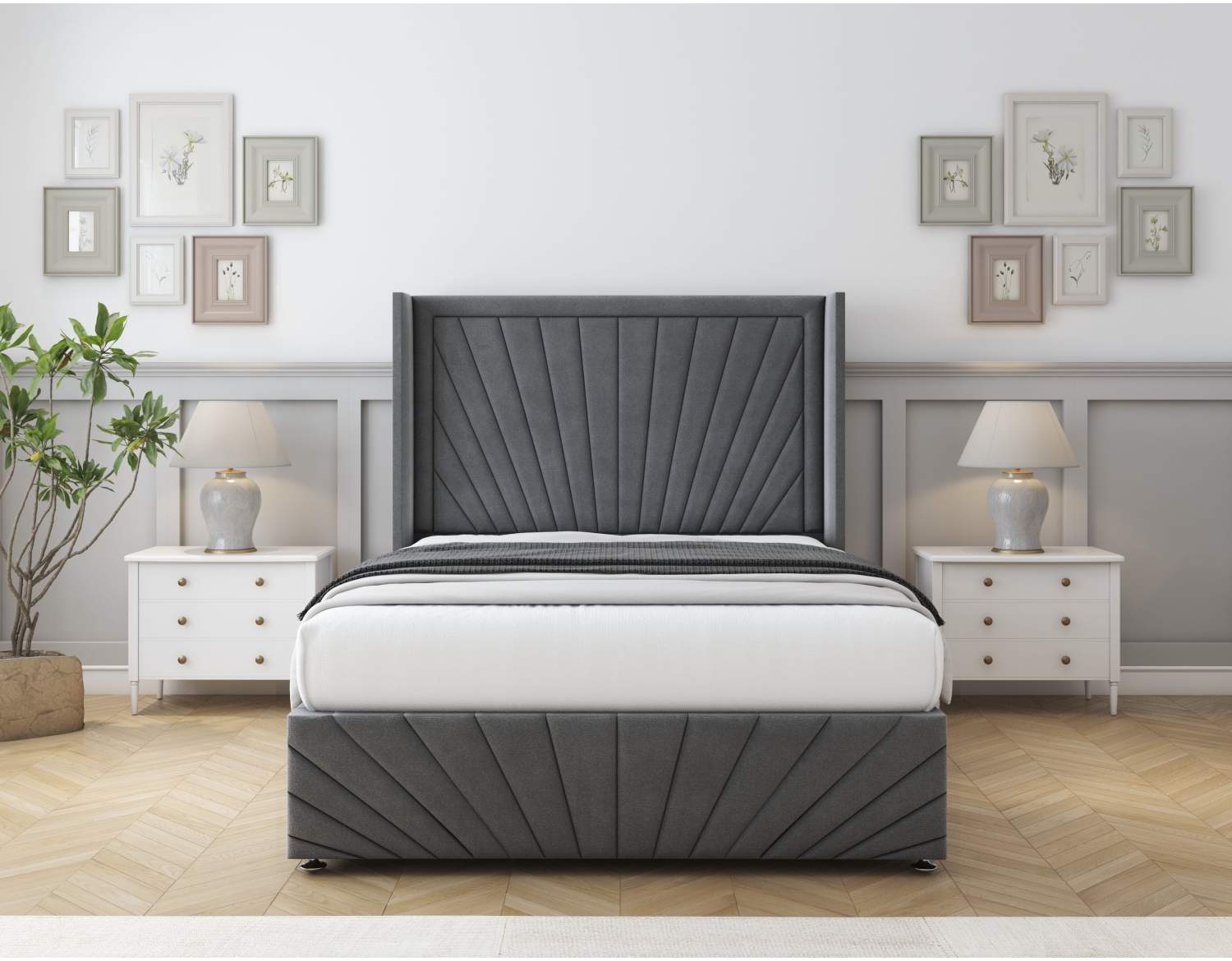 Designed with a beautiful contemporary Wingback Headboard, the Rutherford Divan Bed Set is sure to enhance your living space with its minimalist Sunburst Pattern . If you love these interior design styles, this option will certainly be your thing.