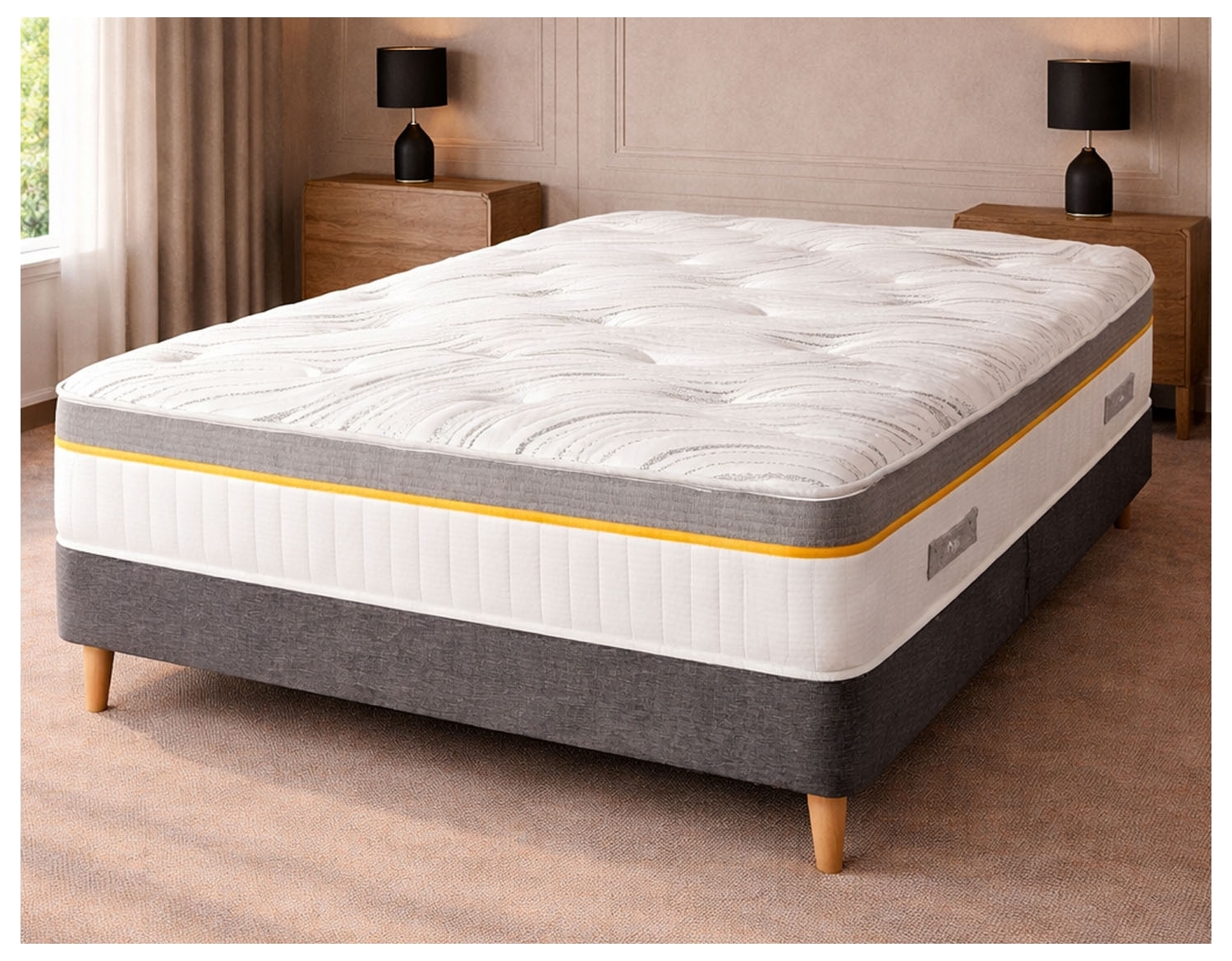 The design of the Serenity mattress is as impressive as its construction. The sophisticated white and grey colour scheme is beautifully accented with a yellow strip, reflecting the firmness and support that this mattress offers. The clean lines and modern aesthetic make Serenity a stylish addition to any bedroom decor, perfectly complementing both contemporary and classic styles.