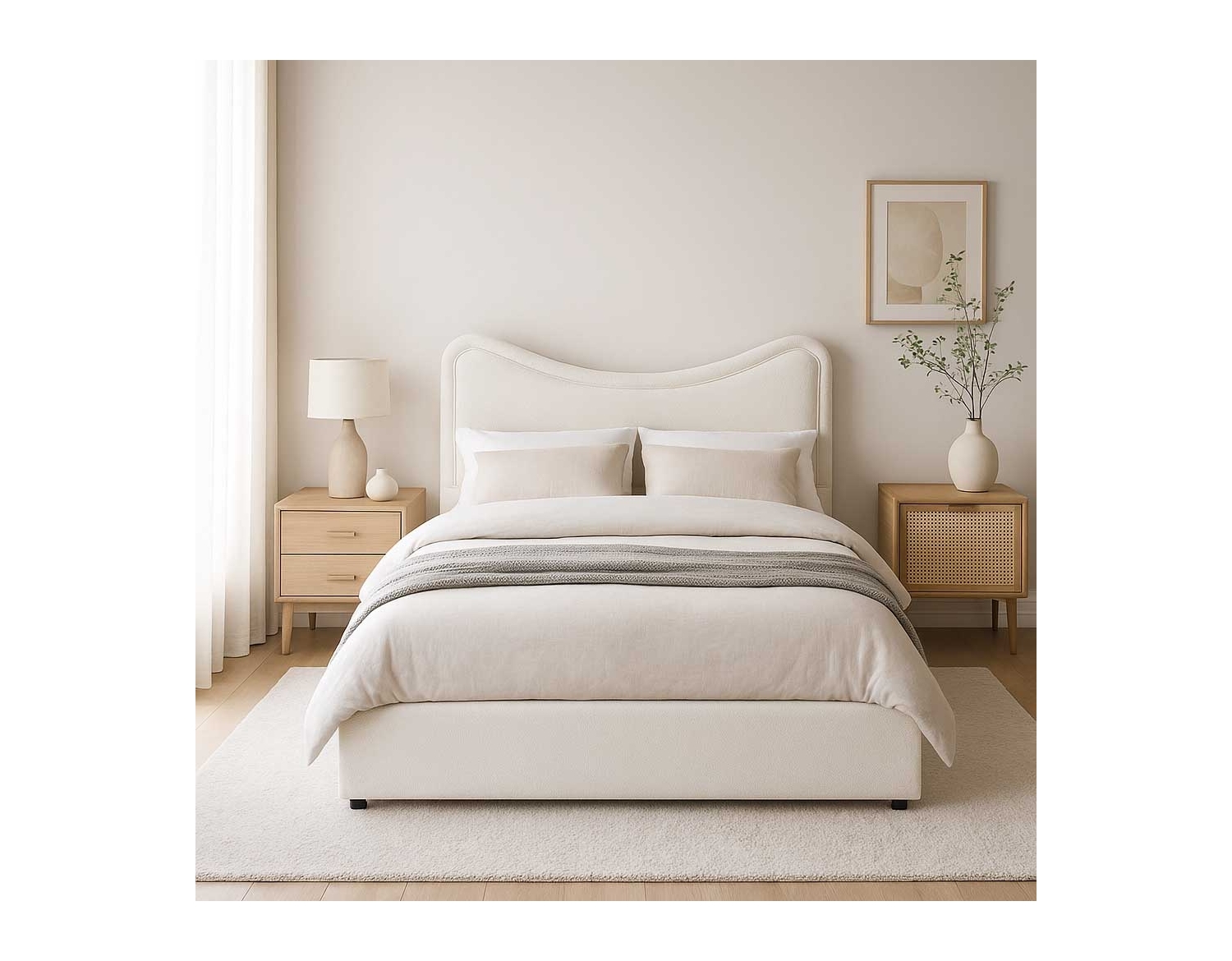 Bring a touch of elegance to your bedroom with the Aurelia contemporary upholstered ottoman bed, featuring a unique wave-style high headboard. Upholstered in soft cream bouclé fabric, this storage bed blends style and practicality, making it the perfect centrepiece for any modern bedroom.